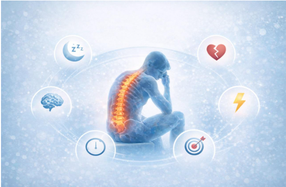 Figura: Impacto del dolor crónico en la calidad de vida. En personas con dolor crónico, el 86% presenta alteraciones del sueño, el 77% refiere síntomas depresivos, el 74% reporta disminución del nivel de energía, el 70% dificultad para concentrarse y el 51% percibe poco o ningún control sobre su dolor. El dolor no solo se siente en la espalda, impacta la vida completa.