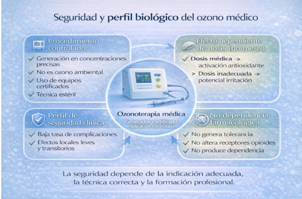 El ozono tiene un comportamiento dependiente de la dosis. En concentraciones médicas controladas puede estimular mecanismos antioxidantes; en concentraciones inadecuadas podría resultar irritante. De allí la importancia del control técnico.