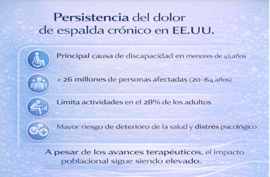 El dolor crónico es uno de los mayores desafíos de salud pública en el mundo moderno. En Estados Unidos, el Institute of Medicine (IOM) estimó que más de 100 millones de adultos (cerca del 25% de la población general) viven con dolor crónico, una cifra superior al número de personas afectadas por diabetes, enfermedad cardíaca y cáncer combinados.
